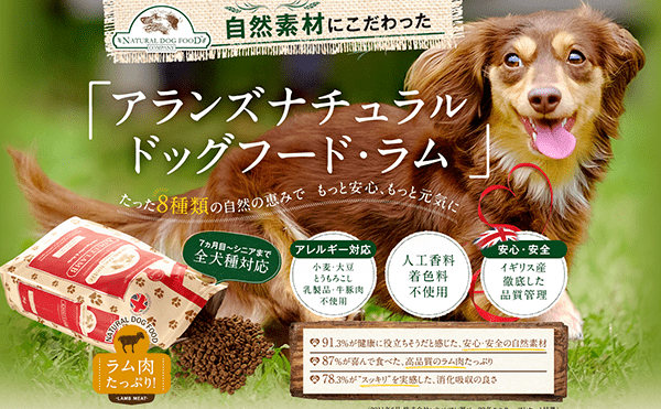 ラム肉(イギリス産)55%、玄米、ベジタブル・ハーブミックス・、全粒大麦、全粒オーツ麦、亜麻仁、テンサイ、ビール酵母