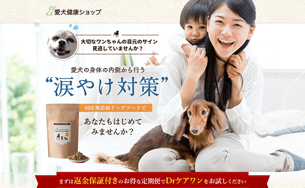 涙やけは、添加物や消化の悪い原材料が入った食事が原因で起こりやすく、Drケアワンでは、無添加にこだわり、消化吸収に良い「玄米・大麦」を使用してお腹の中から健康なカラダ作りをしてくれます!飼い主にも嬉しいプレゼント付き!