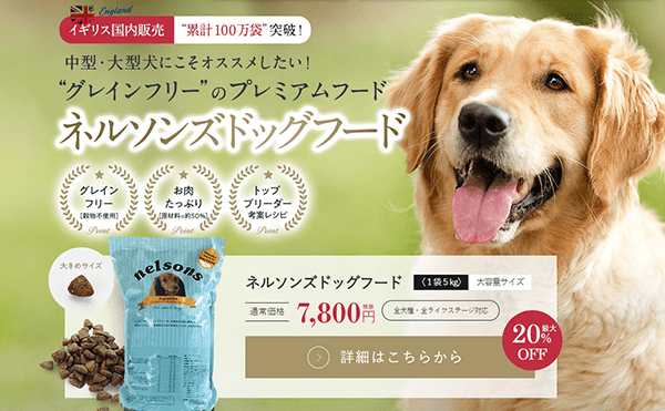乾燥チキン(28%)、チキン生肉(20%)、サツマイモ、ジャガイモ、エンドウ豆、鶏油、バターナッツスカッシュ、チキングレイビー、サーモンオイル、エンドウ豆繊維、ミネラル類(硫酸第一鉄水和物、硫酸銅(II)五水和物、硫酸マンガン一水和物、硫酸亜鉛一水和物、無水ヨウ素酸カルシウム、亜セレン酸ナトリウム)、ビタミン類(ビタミンA、ビタミンD、ビタミンE)、マンナンオリゴ糖、フラクトオリゴ糖、海藻パウダー、グルコサミン、クランベリーエキス、コンドロイチン、ニンジン、グリーンピース、カボチャ、リンゴ、ナシ、ブロッコリー、パースニップ、ペパーミント、パセリ、フェンネル、マリーゴールド、ショウガ、ブドウ種子、酸化防止剤(ミックストコフェロール)